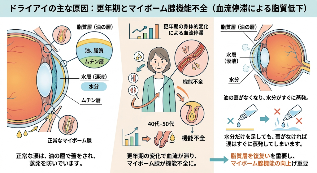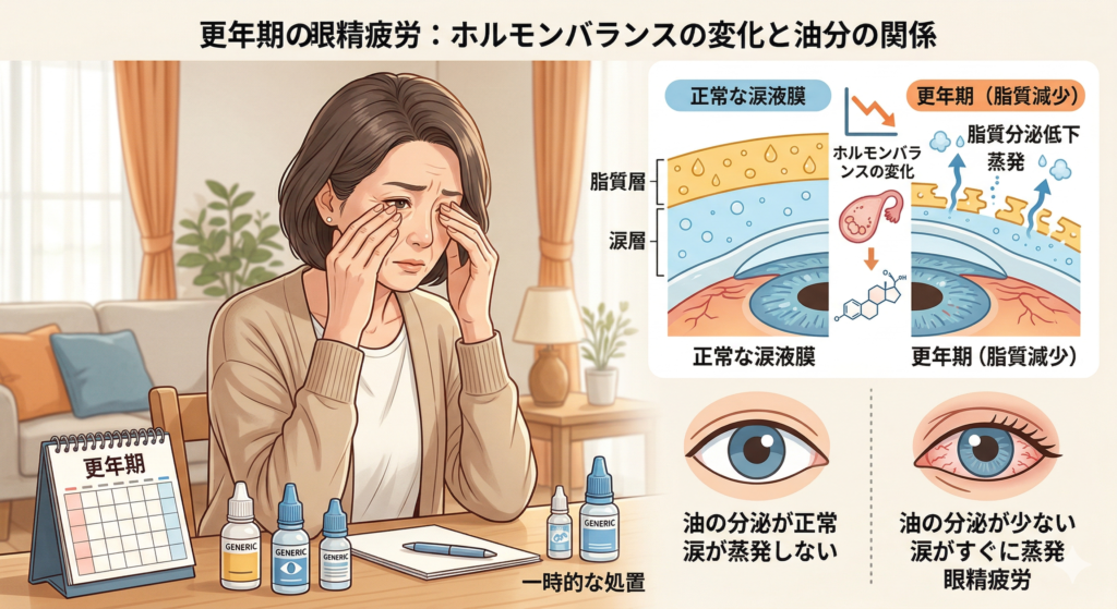 更年期に伴うホルモンバランスの変化は、涙の蒸発を防ぐ「油(脂質)」の分泌機能を低下させ、深刻な眼精疲労を引き起こします。