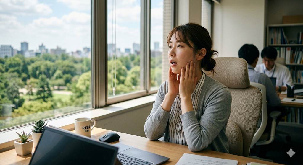 「目が疲れたな」と感じたら、意識的に顎(あご)の力を抜いて、10メートルほど先をぼーっと眺めてみてください。