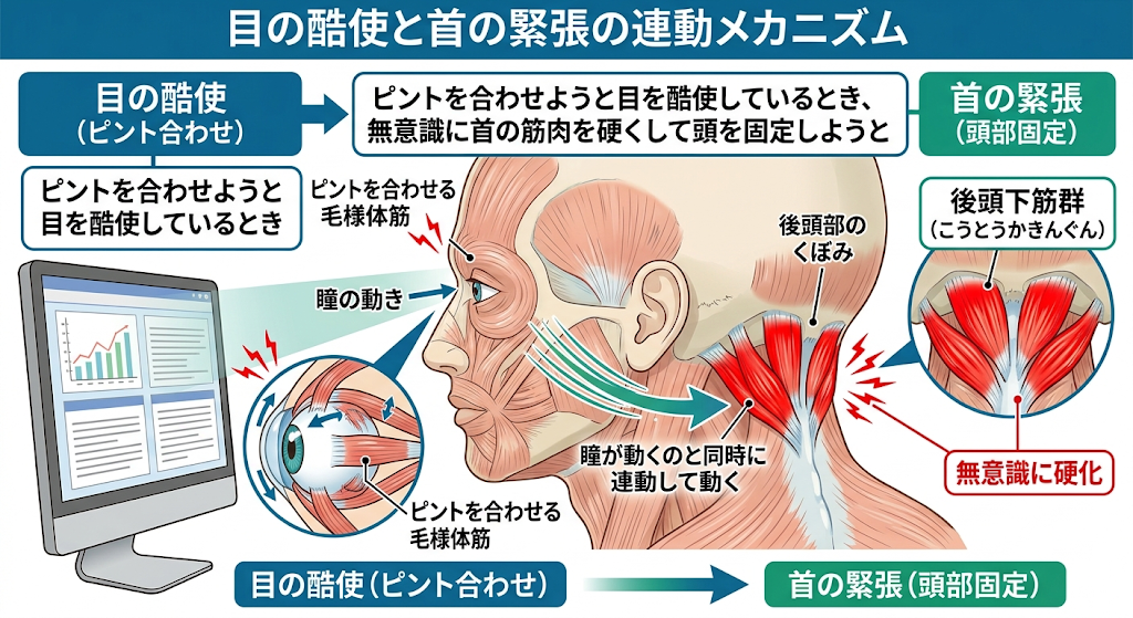 私たちの身体は、ピントを合わせようと目を酷使しているとき、無意識に首の筋肉を硬くして頭を固定しようとします。