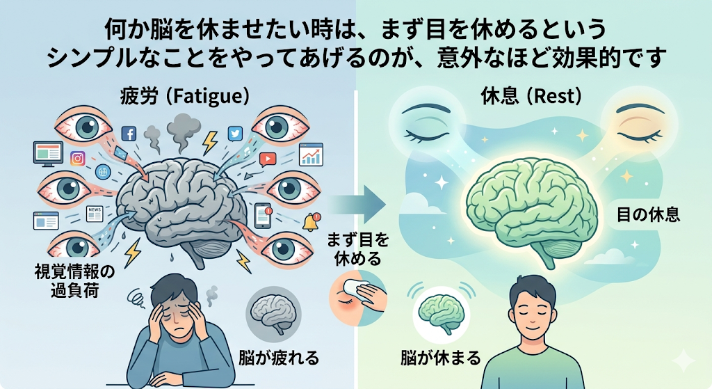 何か脳を休ませたい時は、まず目を休めるというシンプルなことをやってあげるのが、意外なほど効果的です。