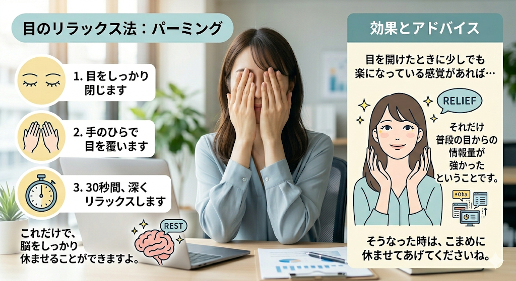 仕事の合間に、30秒間しっかり目を閉じて、手のひらで覆う時間を作ってみてください。